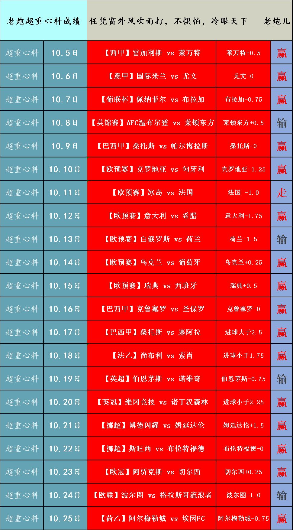 《张国强老师重心料》1、曼城 vs 维拉全场进球大于4.25 输! 2、国际米兰-1.5 输!