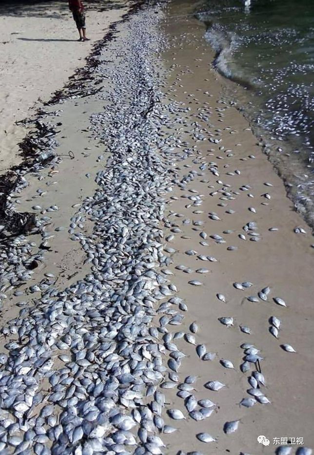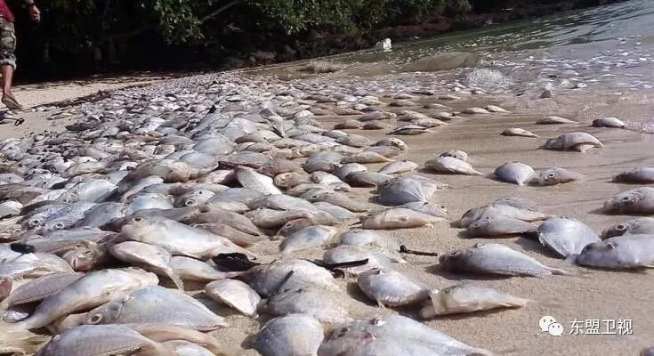 在泰国南部纳卡娅岛,一片长约300米的洁白沙滩周六(26日)出现数百条死鱼,臭味熏天。