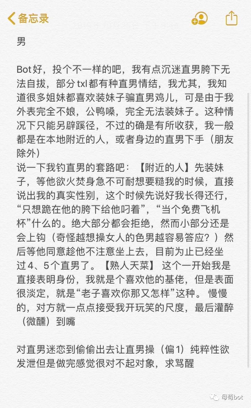 投稿请关注公众号@母苟bot,直接在聊天框中发送文本或图片进行投稿