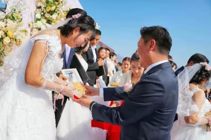 婚礼仪式中,每对新人还获赠了由崂山石和崂山海水定制的爱情纪念品——山盟石、海誓流沙画和著名书法家亲自书写的新时代新婚誓词。崂山区民政局领导现场为新人颁发了结婚证,崂山区委宣传部领导担任证婚人,为新人送上祝福。