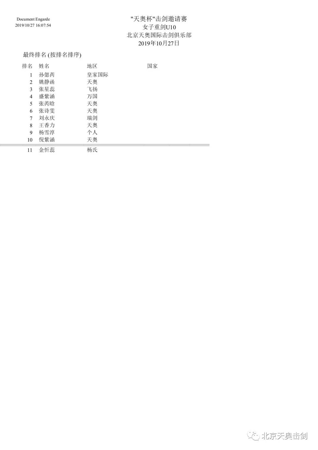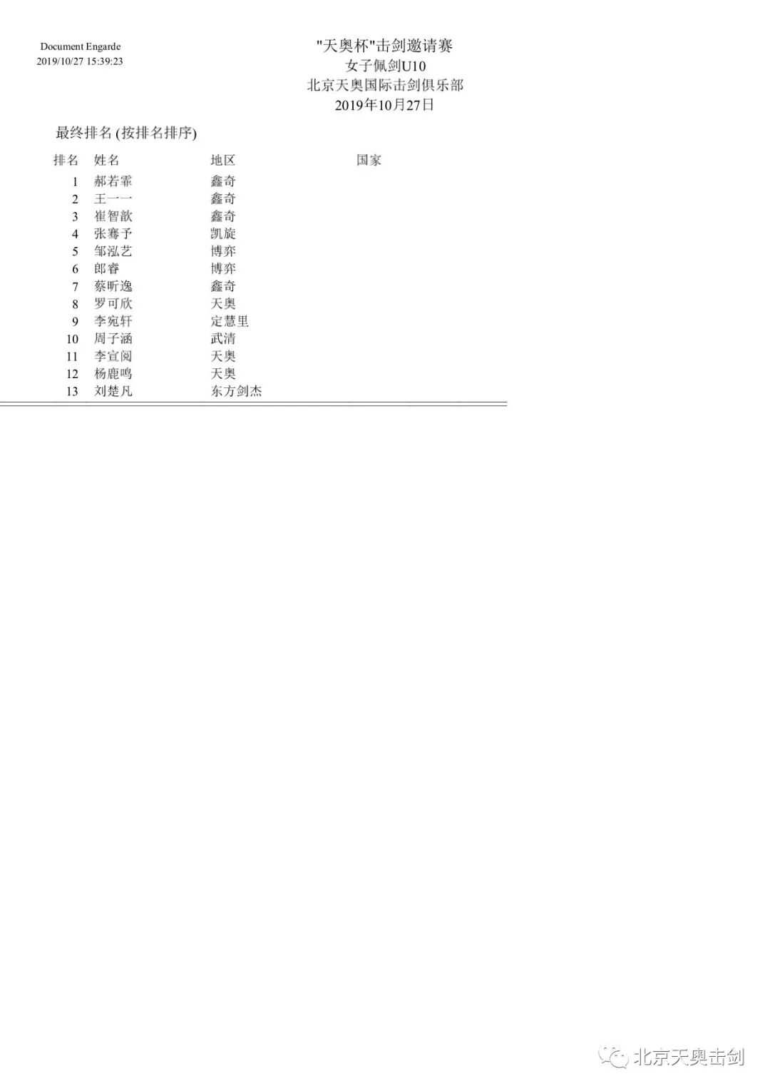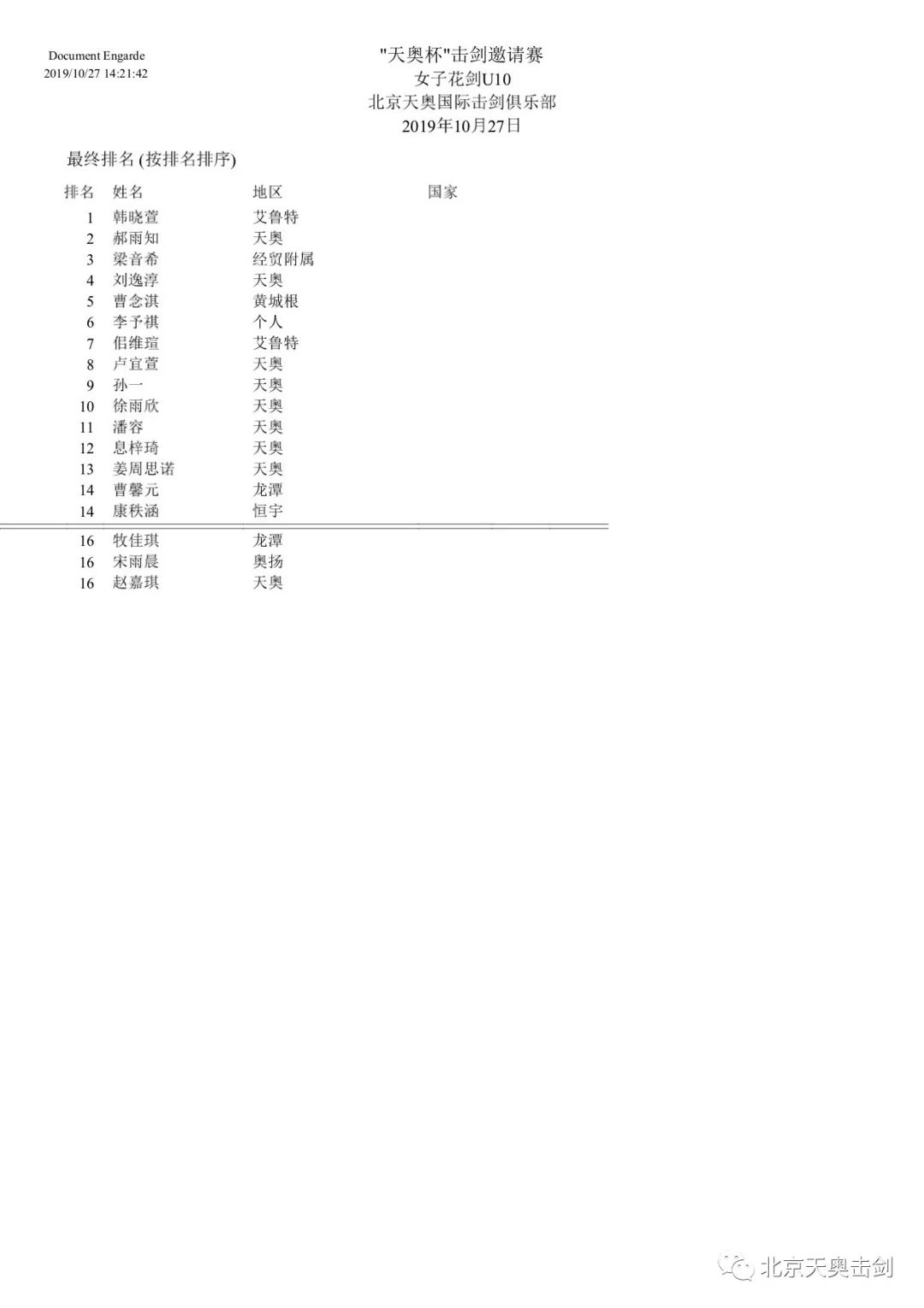 请惠存:“天奥杯”击剑邀请赛10月27日(第二日)最终成绩表