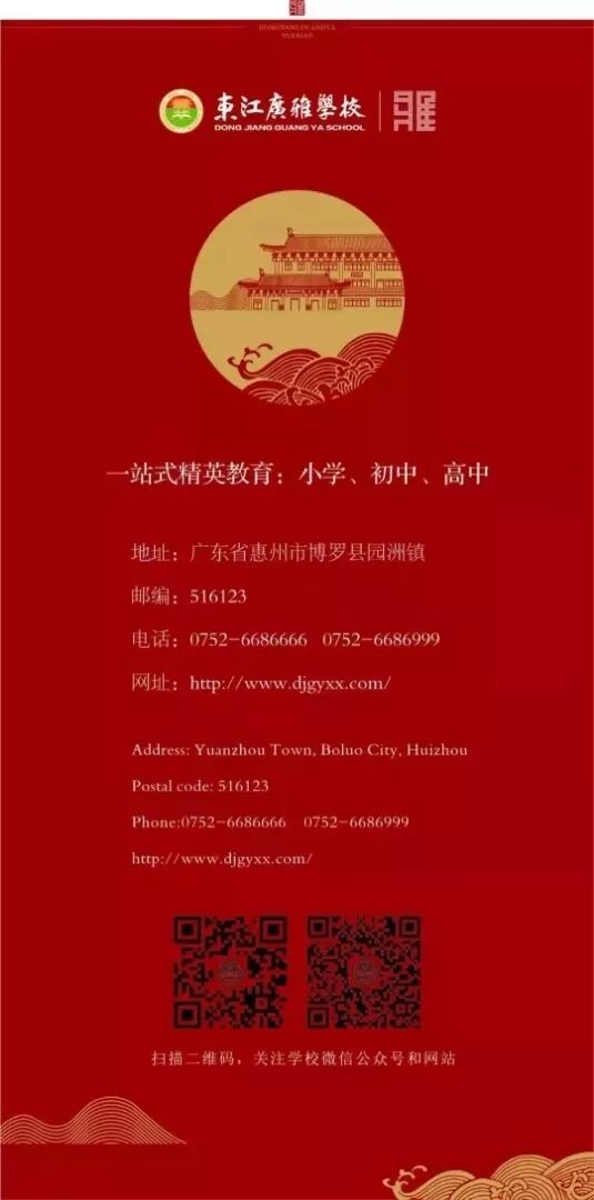 东江广雅学校小学部本着“百年书香正脉 现代精英学府”的办学理念,坚持“中学为体 西学为用”“传承与创新并存”,致力培养“知识广博 品行雅正”的未来社会复合型精英人才。