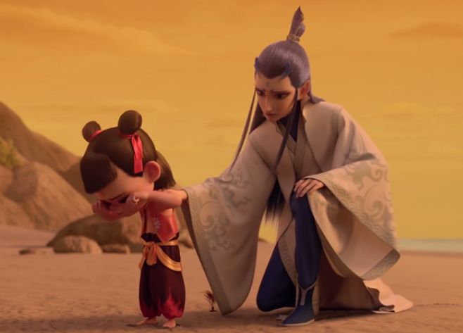 哪吒、敖丙成功从海夜叉手里解救了小女孩,小女孩送给了哪吒一个毽子以示感谢。已经冰释前嫌的哪吒、敖丙两人在海边开心地踢着毽子,踢着踢着,哪吒呆住了,又默默背过身去。