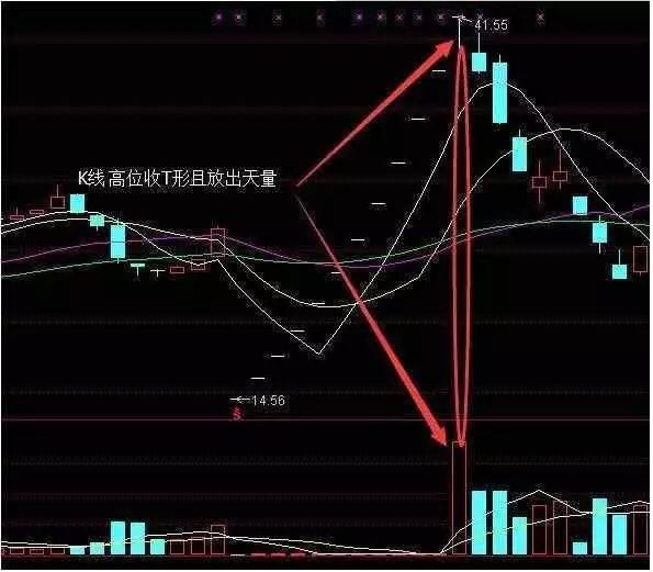 创出新高后,机构抛出一部分筹码,跟风投资者以为后市还会涨,买进的相对积极,不断接盘,尽管当天还是涨停报收,但是却收T形K线,成交量突破入出天量,这说明主力已经在盘中反复震荡出货,股价即将见顶回落了