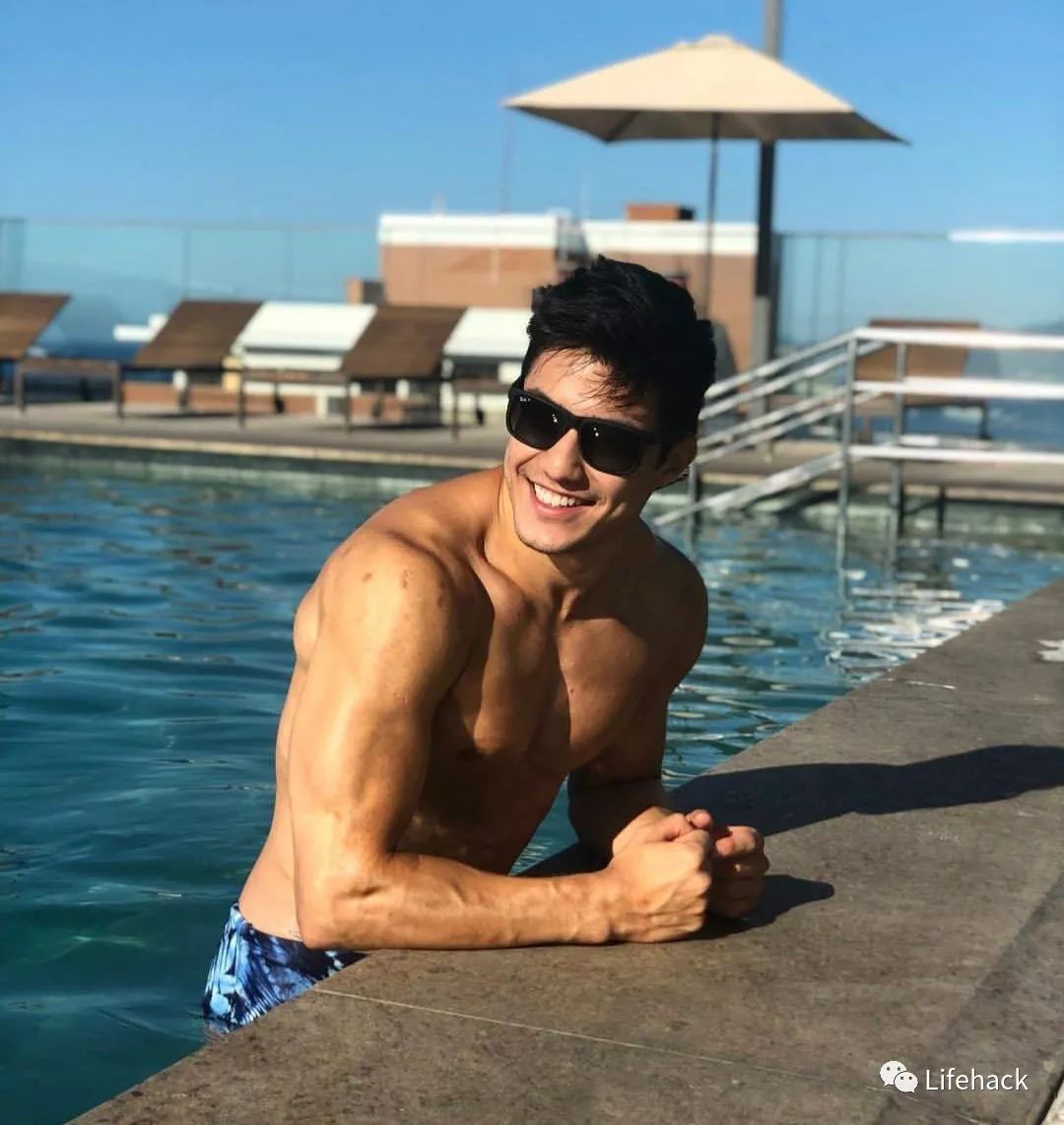 戴着墨镜在泳池边戏水,古铜色的皮肤把他衬托得更加阳刚和健康,这才是纯爷们该有的模样!