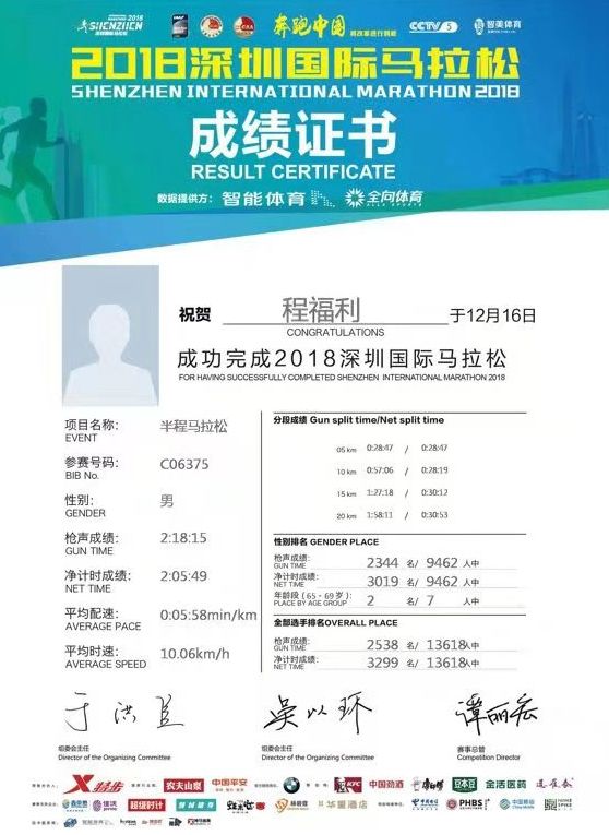 程福利也跑马拉松,参加过7次半马。2015年,他去广州参加李宁10公里路跑联赛,而后便开始挑战半马。下月24日,他又将参加2019深圳南山半程马松赛,那将是他第8次半马挑战。他说,自己最好的半马成绩是2小时5分钟,是在2018深圳国际马拉松上完成的,当时参赛选手年龄段在65-69岁区间的仅7人,自己排名第二。他说,今年的的小目标是希望能在2小时内完成半马。