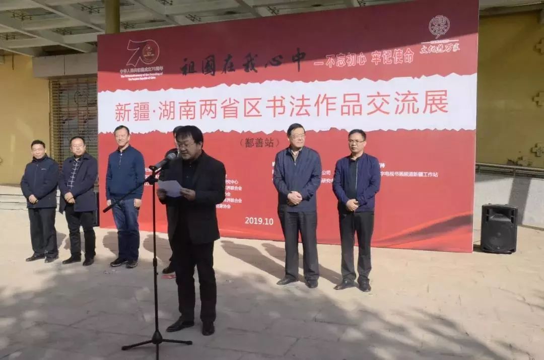 县融媒体中心讯(记者 童浩) 10月26日,新疆·湖南两省区书法作品交流巡展首站展览在吐鲁番市鄯善县美术馆开幕。自治区社科联党组成员、副主席阿里木·亚可夫,自治区社科联学会部部长伍牧原,自治区书法家协会副主席刘建新和社会各界人士近100人参加。