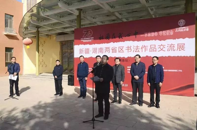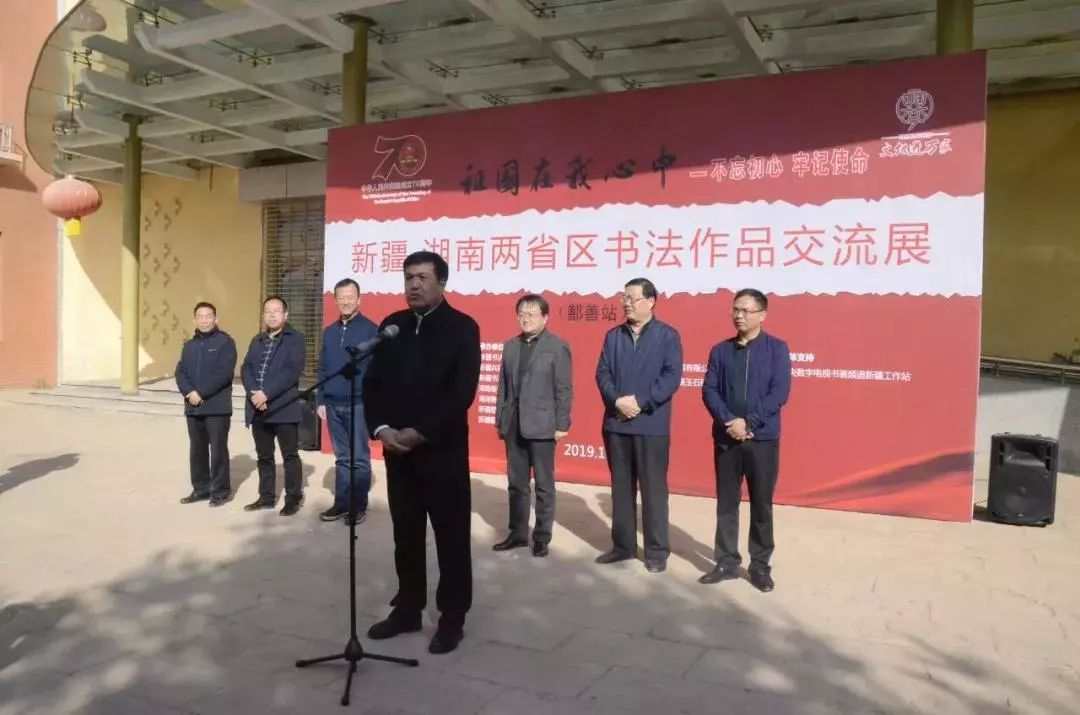 尹立鑫首先代表鄯善县委、县政府对为这次展览给予关心和关爱的领导,为本次展览付出辛劳的新疆书法艺术榜书研究中心,以及为本次展出作品倾注真情和汗水的各位书法家们表示衷心的感谢。他说,此次书法展览的作品是湖南和新疆书法家们优秀作品的一次集中展示。作品的内容是为鄯善古今诗词和自创内容相结合,体现了较高的创作水平。