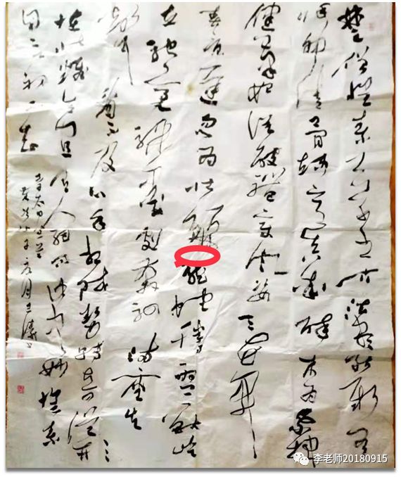 3、作品艺术赏析。一是其为大草,恣肆雄强,纵横不群,迅疾骇人。势来如风樯阵马,气吞山河;势去如平湖秋月,静影沉璧。时而显高山飞瀑、夏云奇峰之状,时而显惊蛇入草、飞鸟出林之态。具有较高艺术震撼力;二是字里行间偶见板桥先生用笔及结构风韵;三是美中不足存在漏字现象。如:第四联:“忽为壮丽就枯涩”一句,少写“就枯涩”3字(详见下图红标处),实属不该。此误影响了整幅作品的艺术效果