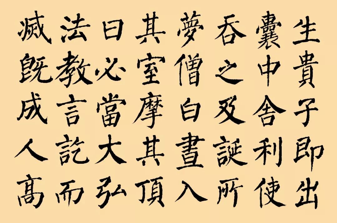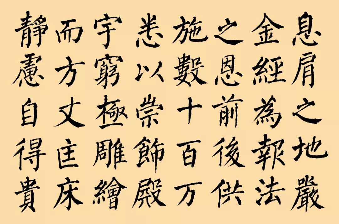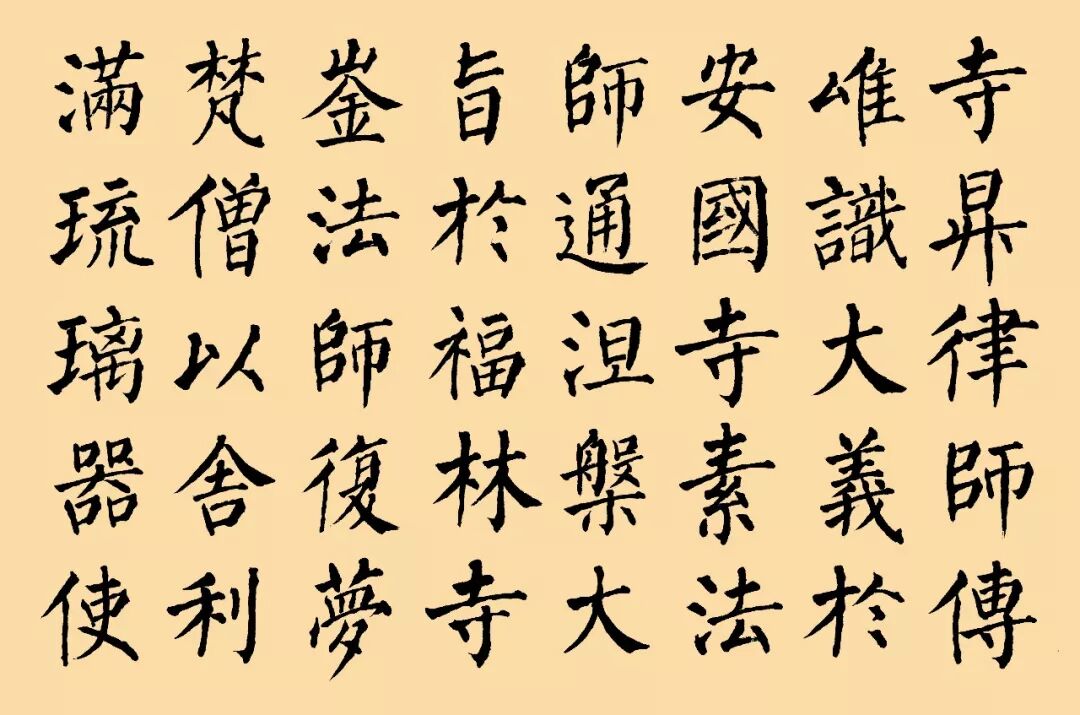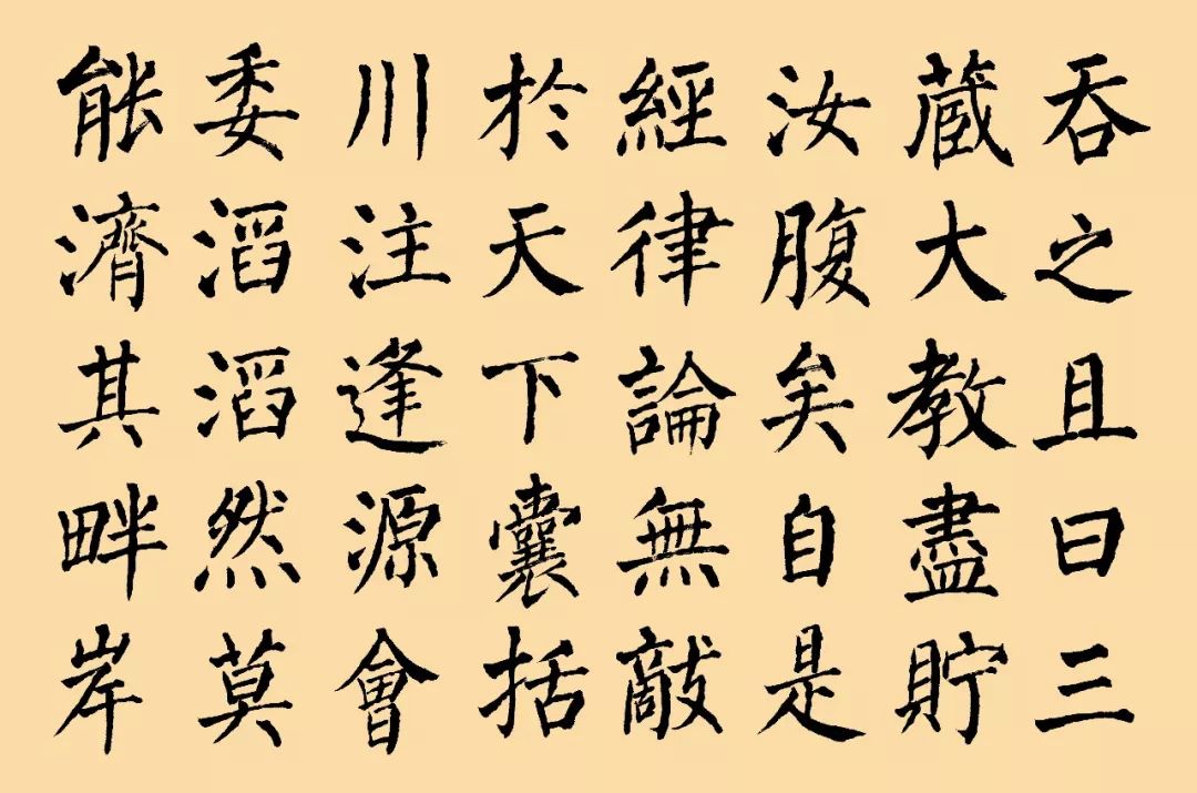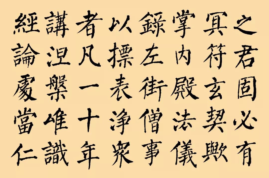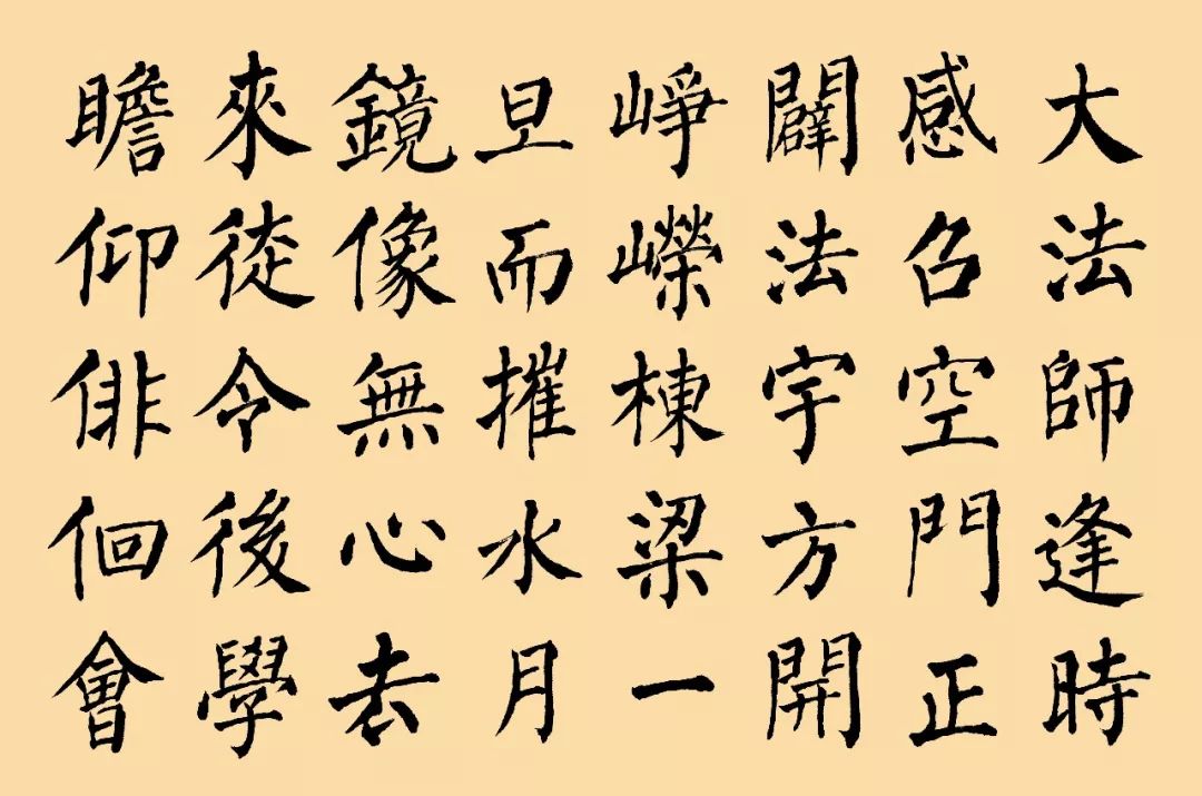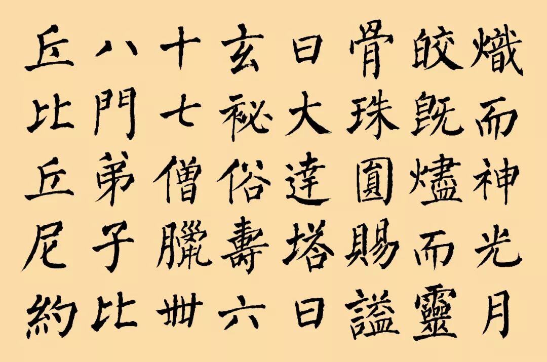 结体:“柳体”的特点为结字中心攒聚收紧,四边伸展舒张,用笔挺拔,筋骨刚健,有内变外棱之评,世有“颜筋柳骨”之誉,《玄秘塔碑》则最为典型。其结体谨严,中宫内敛,四周舒展,寓圆于清刚之内。严谨而不失疏朗开阔之势,仪态冲和,遒劲绝伦。而且结体也充满变化。从完整的碑面情况来看,大多中宫密集、四维开张但也有少数者有意拉开组合部分之间距离(如“以”字就被左右拉开距离)大多取狭长之纵向,但偶尔亦间之以宽博之横向(如“人”、“之”等字);或注重一字之中的曲直对比(如“紫”袍”等字),或注重一字之中主笔突出(如“中”字之中竖、“史”字之末撇等)等等。