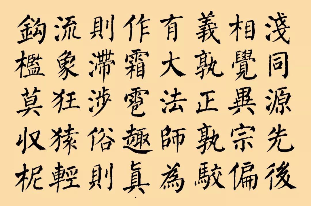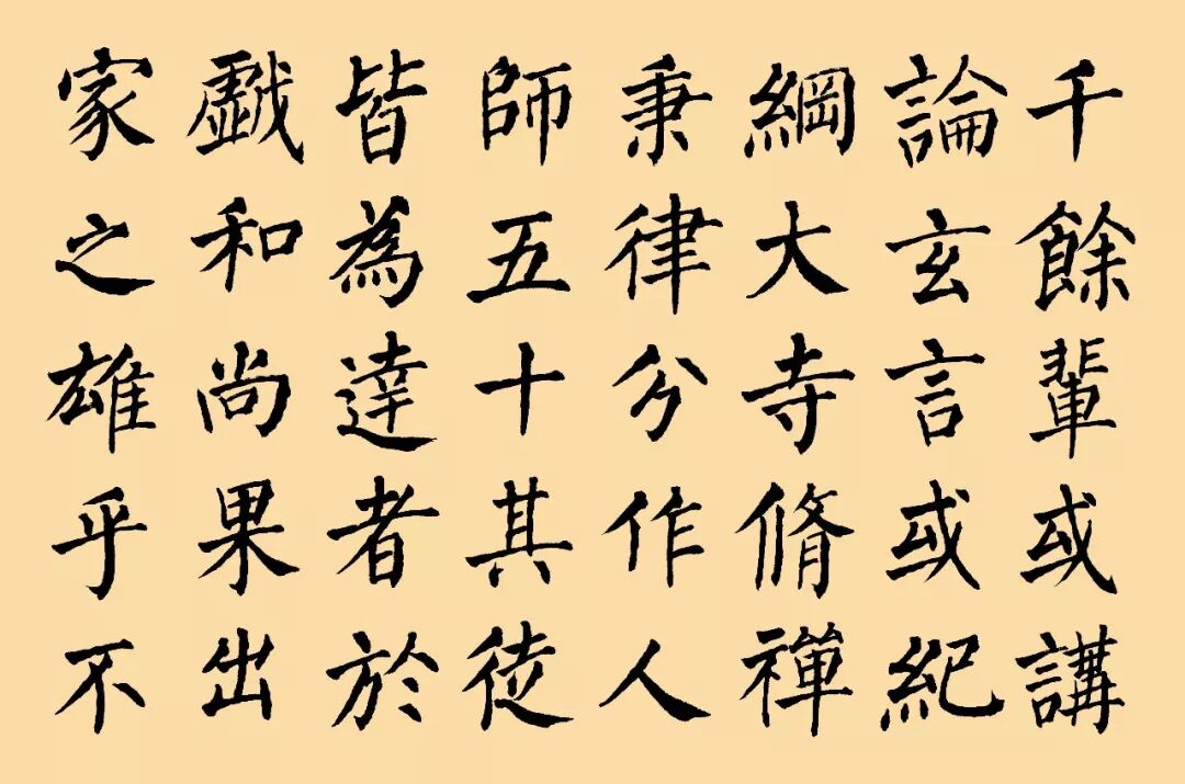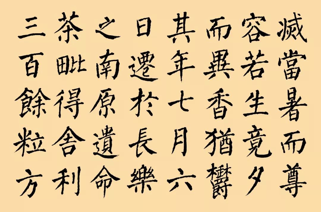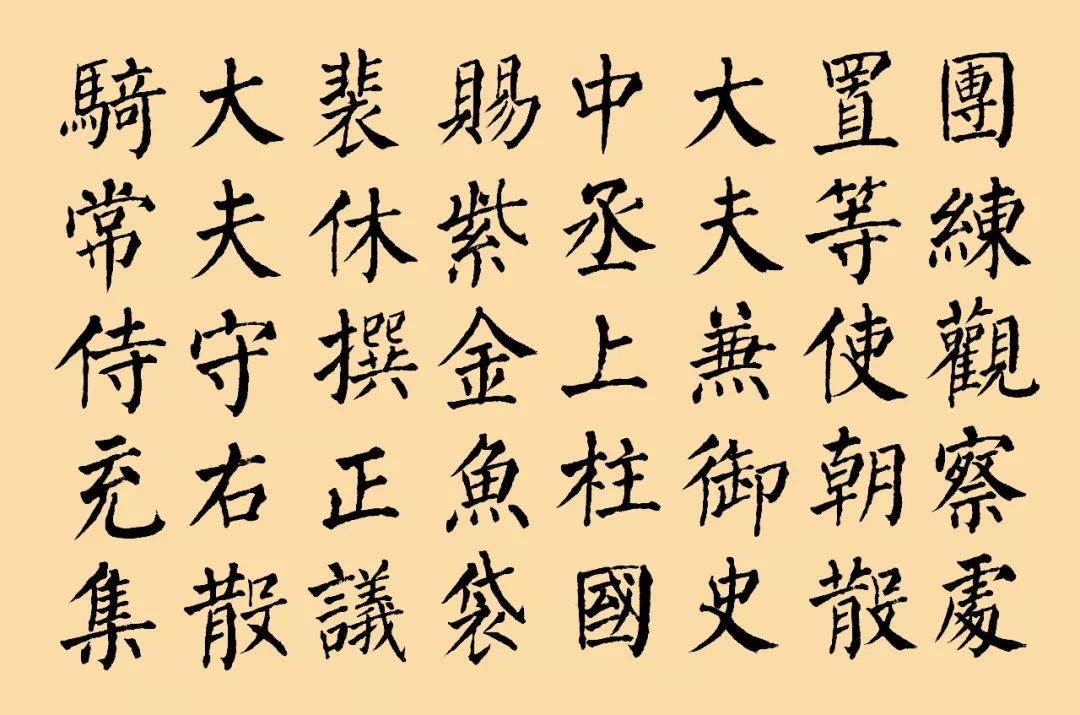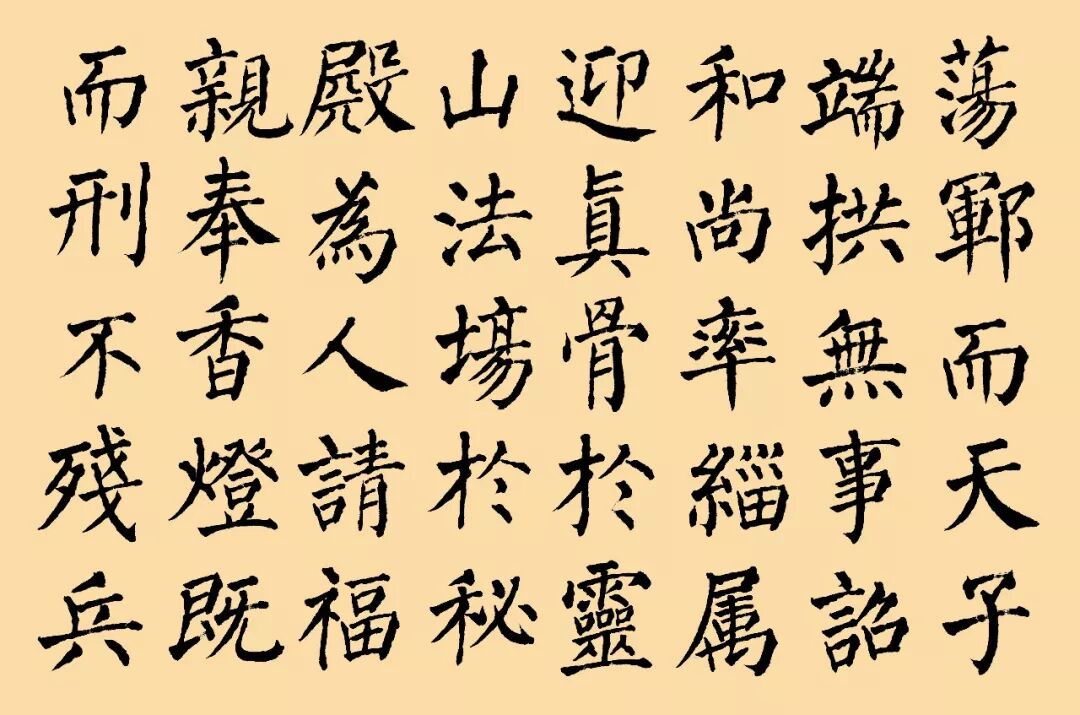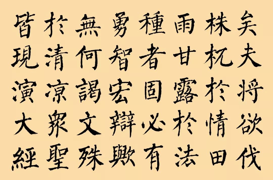 结体:“柳体”的特点为结字中心攒聚收紧,四边伸展舒张,用笔挺拔,筋骨刚健,有内变外棱之评,世有“颜筋柳骨”之誉,《玄秘塔碑》则最为典型。其结体谨严,中宫内敛,四周舒展,寓圆于清刚之内。严谨而不失疏朗开阔之势,仪态冲和,遒劲绝伦。而且结体也充满变化。从完整的碑面情况来看,大多中宫密集、四维开张但也有少数者有意拉开组合部分之间距离(如“以”字就被左右拉开距离)大多取狭长之纵向,但偶尔亦间之以宽博之横向(如“人”、“之”等字);或注重一字之中的曲直对比(如“紫”袍”等字),或注重一字之中主笔突出(如“中”字之中竖、“史”字之末撇等)等等。