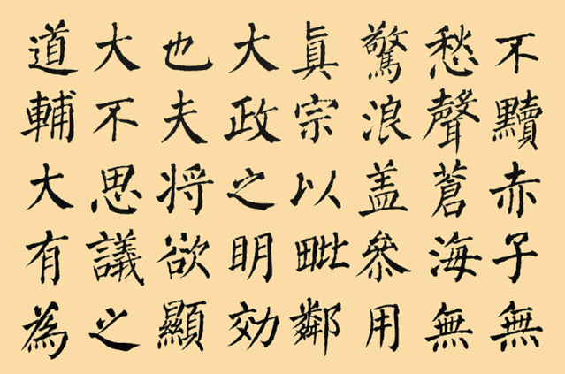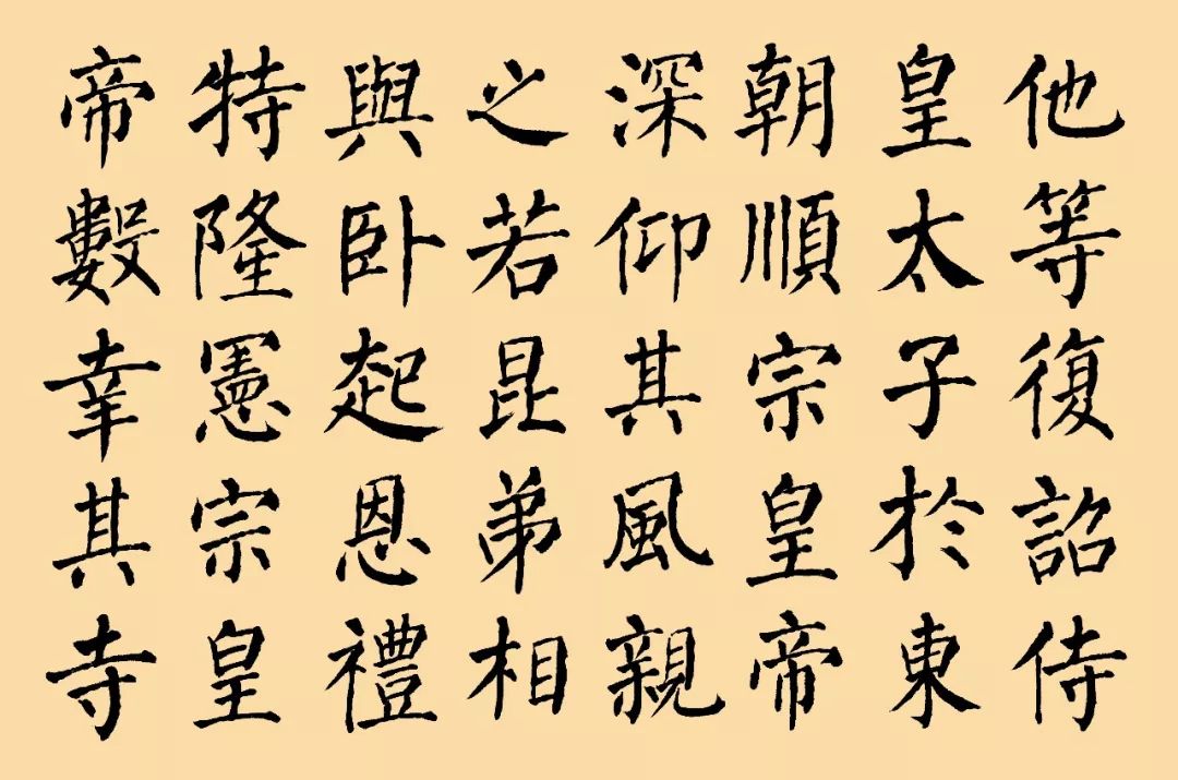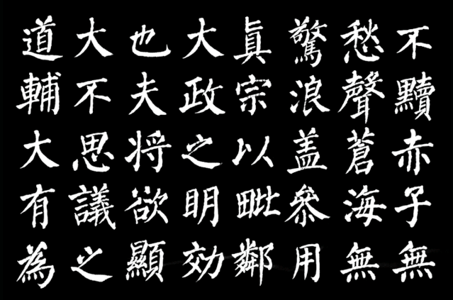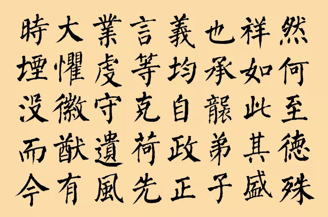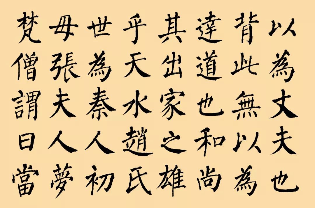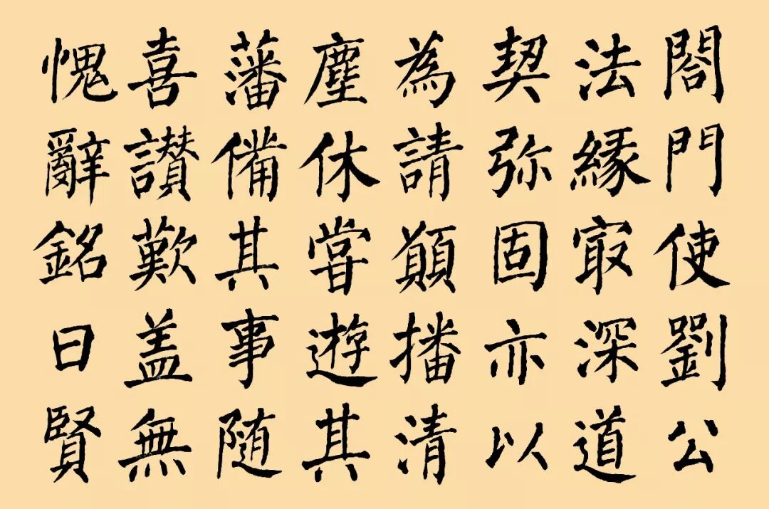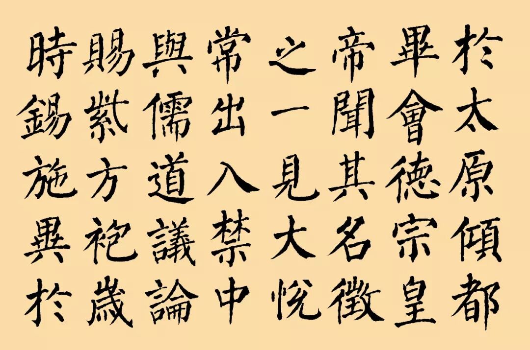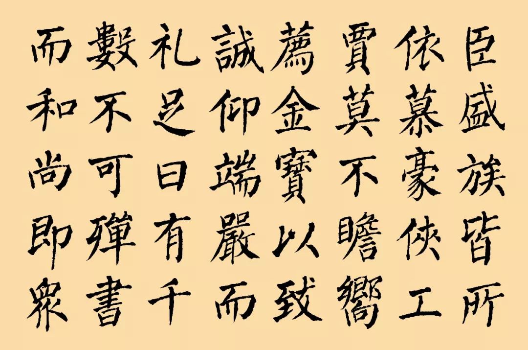 结体:“柳体”的特点为结字中心攒聚收紧,四边伸展舒张,用笔挺拔,筋骨刚健,有内变外棱之评,世有“颜筋柳骨”之誉,《玄秘塔碑》则最为典型。其结体谨严,中宫内敛,四周舒展,寓圆于清刚之内。严谨而不失疏朗开阔之势,仪态冲和,遒劲绝伦。而且结体也充满变化。从完整的碑面情况来看,大多中宫密集、四维开张但也有少数者有意拉开组合部分之间距离(如“以”字就被左右拉开距离)大多取狭长之纵向,但偶尔亦间之以宽博之横向(如“人”、“之”等字);或注重一字之中的曲直对比(如“紫”袍”等字),或注重一字之中主笔突出(如“中”字之中竖、“史”字之末撇等)等等。
