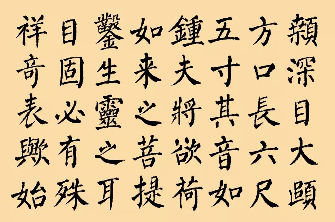 点画上有两大显著特点:其一,有如截铁,圭角分明,方折峻整,别具特色。横轻竖重,短横较粗壮,长横格外瘦长,起止交代清楚。竖画顿挫有力,行笔挺劲舒长。撇画较锐利笔势修长。捺画粗重,用笔干净利落,与撇画形成鲜明的对比。其二,点画多样,变化丰富,别具一格。以“点”论,就有圆点、方点、短横点、横折点诸种;以竖”论,或圆起圆收、或圆起而露锋尽势;以“横”论,大多方起圆收,但多画重叠之时(如“三”、“寺”等字)必出之以不同形态;以“撇”论,有长长的兰叶撇,有短促的利剑撇,更有别致的回锋撇(如“凡”字的左撇)。
