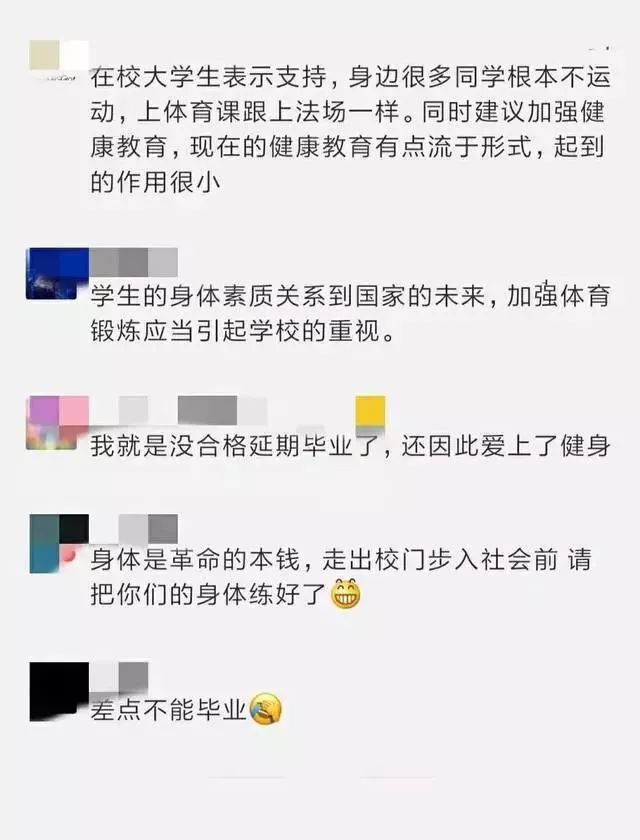 《意见》指出,增加学生投入学习的时间,提高自主学习时间比例,引导学生多读书、深思考、善提问、勤实践。合理增加学生阅读量和体育锻炼时间,以适当方式纳入考核成绩。加强学生体育课程考核,不能达到《国家学生体质健康标准》合格要求者不能毕业。此消息一出,网友炸开锅。不少人表示,”庆幸自己毕业得早!““这个规定很必要”