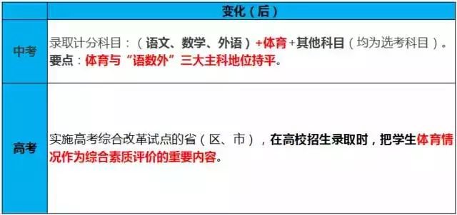 现在的孩子虽然个头越长越高了,但体力方面确实比不上上一代人。虽然吃得更好了,身体素质是越来越差了。究其根本还是:体育运动太少了!而忽视体育运动的直接后果是:越来越多的孩子在各项体育测试中不达标,身体素质越来越差。军训途中晕倒,体测出现晕倒、甚至猝死的情况屡屡发生,青少年肥胖问题,日益严重。国家对学生体育锻炼的重视,在中高考改革的细节中凸显。根据教育部公布的细节:中考改革从2017年开始试点,到2020年成型;高考改革则早在2014年开始试点,到2018年(目前部分地区有推迟)大致结束。教育部明确要求中小学将下列三大要素纳入初中、高中学业水平考试,纳入学生综合素质评价体系:运动技能等级运动技能等级学生参加体育活动情况学生参加体育活动情况学生体质健康状况学生体质健康状况教育部明确指出的中高考改革“新”在哪?