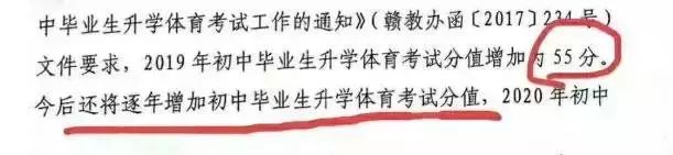 江西省教育厅有关负责人告诉记者,初中生一定要重视体育,体育的分值确实在逐年增加。安徽:“6连涨”后首次未涨传言今年安徽省中考体育分值将从60分涨至70分,前一段,安徽省教育厅公布2019年体育中考方案确定,今年体育总分值60分,与去年分值相同。这也是我省体育中考总分值自2013年起“6连涨”后首次未涨。● 从2013年起,安徽省就提出“逐步增加初中毕业体育考试成绩在学生综合素质评价和中考成绩中的权重”,要求“不低于35分”;● 2014,增加到“不低于40分”;● 2015年,我省中考体育的总分值再增加5分,要求“不低于45分”;● 2016年,全省中考体育的总分要求“不低于50分”;● 2017年,“不低于55分”;● 2018年,“不低于60分”;武汉:2020年中考体育分值将增根据去年发布的《武汉市推进高中阶段学校考试招生制度改革的实施方案(试行)》,从2020年开始中考体育考试的分值将大大增加,从原本的30分一下增加到50分,据悉在考试科目和形式上也会有所调整。据悉,2019年的体育中考科目并无变化,2020将会如何调整,暂未收到官方确切通知,但未来调整方向已初见端倪。据透露,中考体育考试中的项目选择度会大大增加。主要分为三类,第一类耐力必考,第二类、第三类学生可以自主选择。2023年体育中考各类别项目第一类耐力类,男生1000米,女生800米第二类能通过智能仪器测试的一些项目,如50米、实心球、立定跳远、引体向上、仰卧起坐第三类三大球,也就是足球、排球、篮球虽然新中考的正式实施要到2023年,但是从明年起,中考体育考试会有微调。贵阳:体育中考调整为一年一考贵阳市改变了以前初三下学期一次性、终结性考试的状况,将体育考试内容按1+N模式分散到各年级中进行。将3年1考调整为1年1考,提高学生每天1小时校园体育活动的实效,增强学生的运动能力,养成良好的生活习惯,改善学生的体质健康水平。河南:体育不达标,孩子学习再好也没用!2018年5月,河南省教育厅等四部门联合制定并印发《关于强化学校体育促进学生身心健康全面发展的实施意见》,对孩子们喜闻乐见的体育课做了硬性规定,普通高中、中等职业学校和普通高等学校学生毕业时,成绩达不到50分者按肄业处理。国家为什么越来越重视体育呢?因为体育运动太重要了。体育运动不仅会改变你的躯体,更多的是会塑造你的性格,不仅强身,更能强志。我们在关注文化教育的同时,也不能忽视身体素质教育。?国家卫健委表示,我国6-17岁儿童青少年超重率是9.6%,肥胖率6.4%,二者相加达到16%?在不满17岁的青少年儿童中,有1/3的孩子至少出现了一种心血管危险因素。中国12至18岁的孩子中1.9%患有糖尿病,相当于美国同龄人(0 .5%)的四倍。?新华网报道:2018年,我国发布首份《义务教育质量监测报告》,报告指出四年级、八年级学生视力不良检出率分别为36.5%和65.3%。相比之下,美国青少年的近视率约为25%,澳大利亚仅为1.3%,德国的近视率也一直控制在15%以下。最近一则某中学初中生做引体向上的体能测试新闻,在各大媒体平台上刷屏,因为结果只能用四个字形容——惨不忍睹。