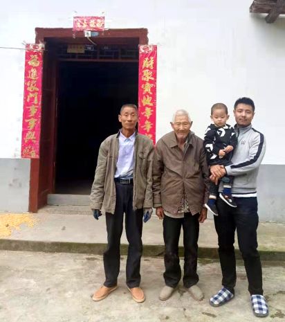 随后,他传给我两张照片。一张是他们四代同框的照片,中间是四叔,只见他满头银丝,背部微驼,不甚明朗的笑容,映衬出耄耋老人特有的宁静与安详;左边是四叔的二儿子,我叫他双哥,内穿洁白的衬衫,外着一件衣领显然有些发毛了的土黄色上衣,黑色长裤上,锃亮的皮带扣特别耀眼,脚蹬棕色休闲皮鞋,手戴一双发黑了的白手套,显然是在劳作中的仓忙之际,被儿子拽过来照相的。他身板笔挺,皱纹如沟壑般密布,目光看似坚定,却透出了些许飘怱和茫然;右边便是堂侄和平,他是八零后,神情淡定,蓄着黝黑的小胡须,趿着拖鞋,怀抱着他的儿子,小男孩眉宇清秀、皮肤白净,浑身透出一股机灵劲儿。